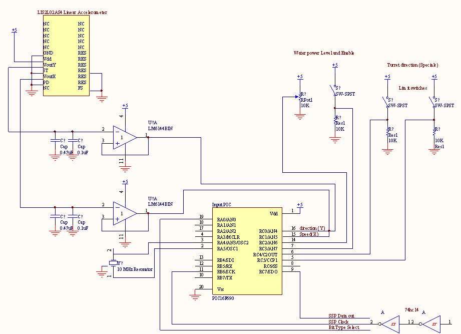 We encountered many difficulties in correctly receiving data from the Com PIC. Eventually, we traced this problem down to the interactions between two slave PICs reading the same input line. For this reason, we used a rail-to-rail op-amp to buffer the clock and data in lines to each actuator controller. This solved our problems with inconsistent readings. Beyond that, all implementations for the actuators were fairly standard and will be discussed quickly, one at a time.