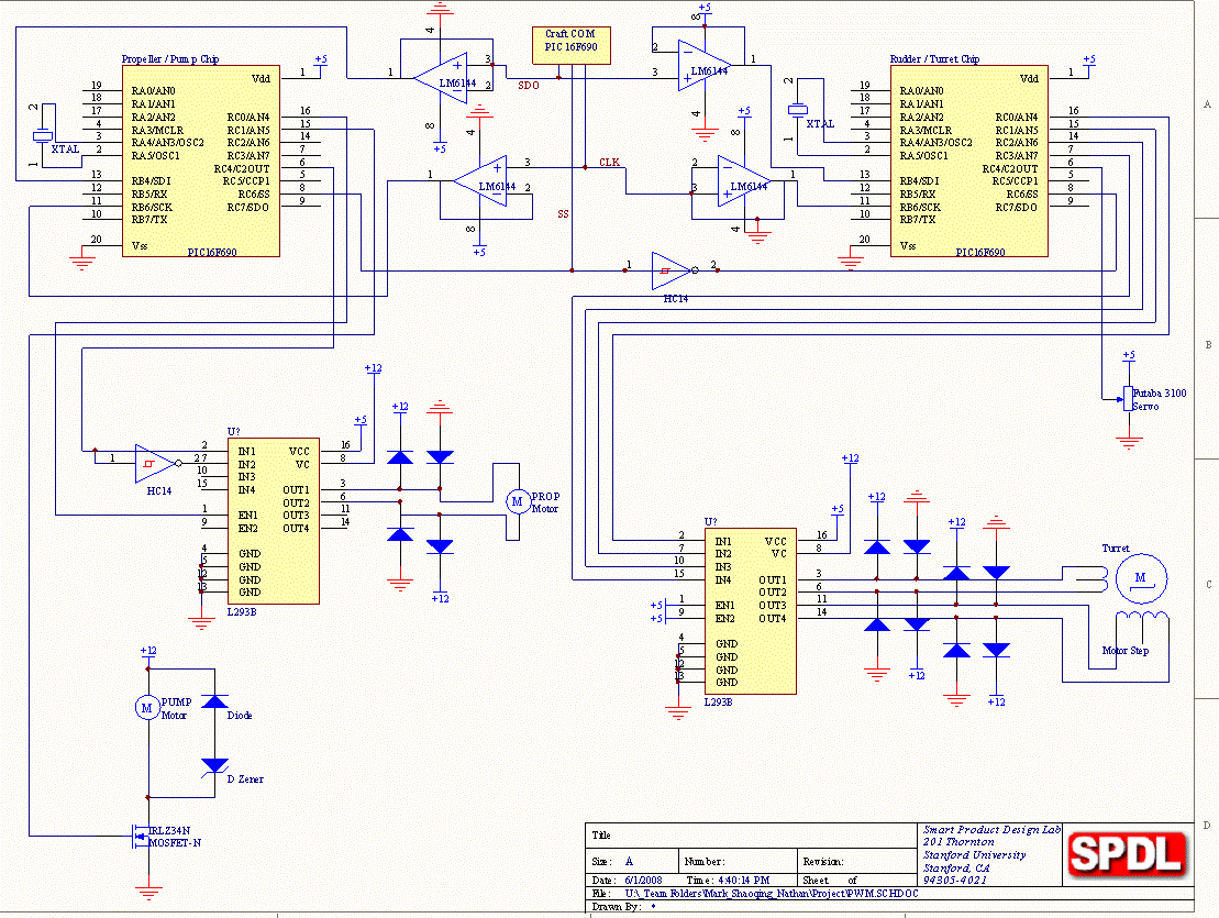 Two PICs were chosen in order to most simply control the actuators. Each PIC has only a single hardware PWM channel, so we decided to use a software-driven PWM for each the propeller, the pump, and the servo.