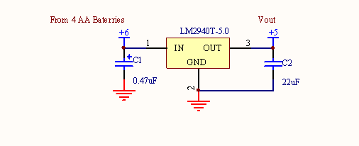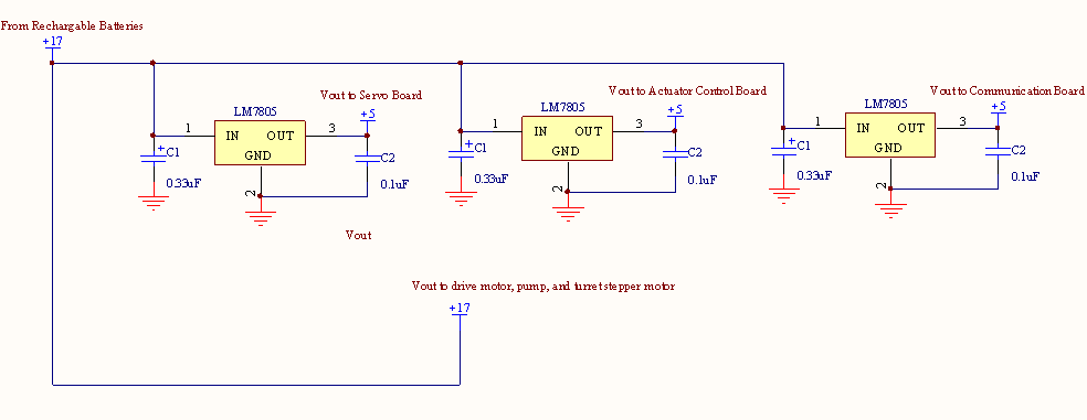 regulated to 5V, through three separate LM7805 1A regulators (One for the