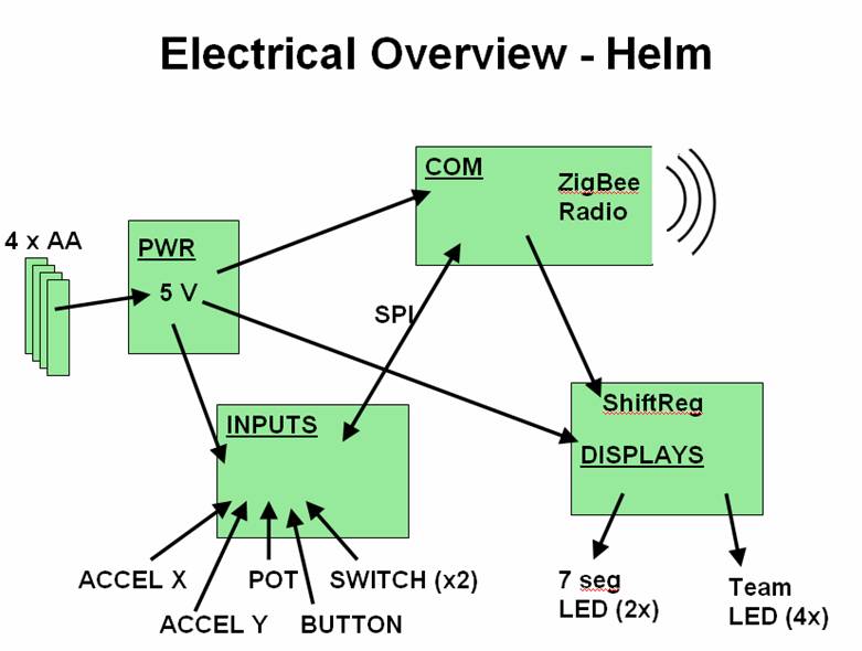 The helm’s game state machine is running on the PIC on this board. It handles the signal going to and received from the ZigBee chip through SPI. The signal coming from the Helm Control Inputs Circuit is read through SPI, because two bytes are needed to get all control signals (direction, driving power, pump power, special function), RC0 is used as General Input see what kind of data the byte received indicates.
