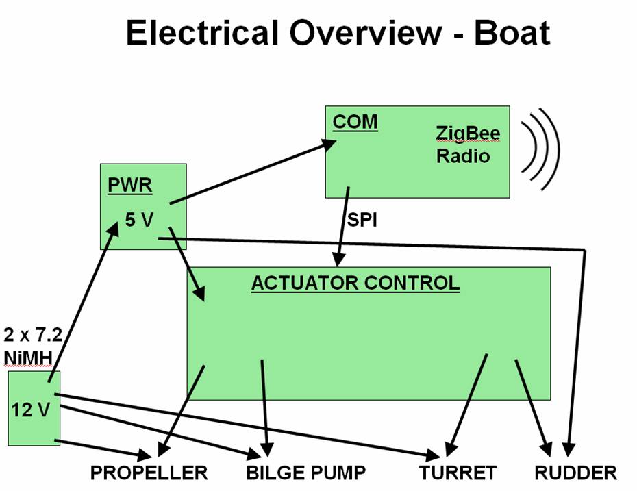 The boat’s game state machine is running The PIC on this board. It handles the signal going to and received from the ZigBee chip through SPI, interprets the command received, and send out control signals to the actuator control board through SPI, since there are two PICs to talk to on the actuator control board, RC0 is used as General Output to select which PIC to talk to.