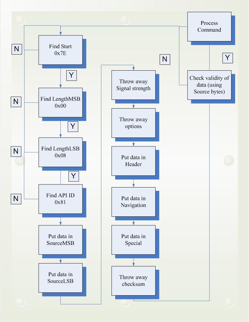 Byte 1 10. ME218 Byte 2 11. Checksum § checksum = 0xFF – Σdataframe Checksum: Not including frame delimiters and length, add up all bytes keeping only the lowest 8 bits of the result and subtract from 0xFF. The validity of incoming packets was determined by checking the first four bytes of the packet. If the first four bytes matched their expected values, then the packet was determined "valid" and processed. A state machine outlining this process may be found by clicking the thumbnail below: ![]() |