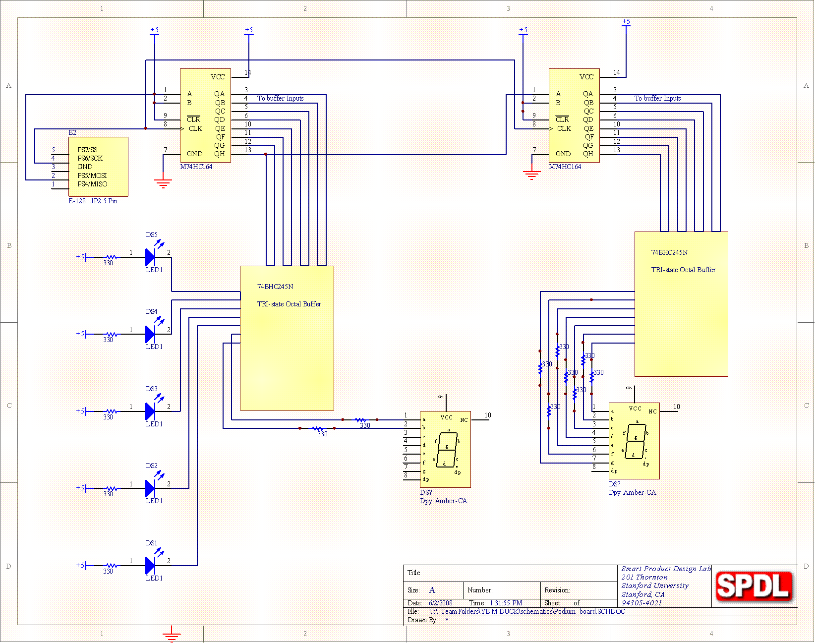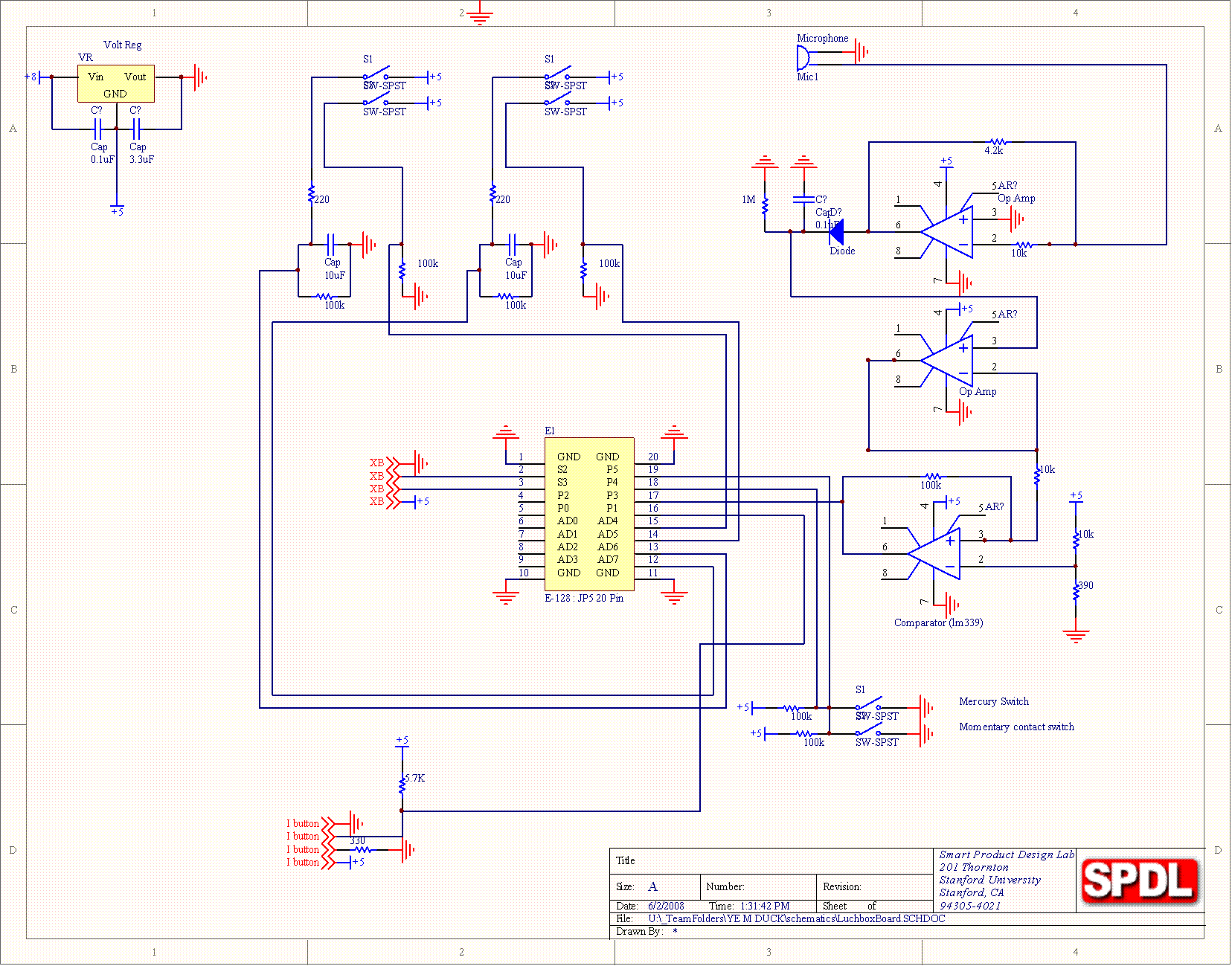 There are two main boards for the helm, the lunch board and the podium board. The lunch board was mounted in a small lunch box with the E128 processor and the podium board was located on the helm's main podium. Click the thumbnail for a larger image Lunchboard: ![]() The lunch board holds the circuits for signal conditioning on the inputs. For each drumstick there is a simple button with a pull down for reverse and a switch that dumps charge into an RC circuit to measure how much/hard/fast someone is drumming. The mic input is amplified, and then half-wave rectified and then lowpassed filtered and switch with hysteresis to turn a high frequency content high amplitude sinusoid into a digital solid digital high. The other buttons are also simple switches with pull up or pull down to become digital signals, debouncing is done digitally. Podium board: ![]() This board uses the E128's built in Synchronous Serial to shift in 2 bytes of data to be displayed on the 16 LEDs that populate the helm. Octal tri-state buffers provide the power to run the LEDs. | |